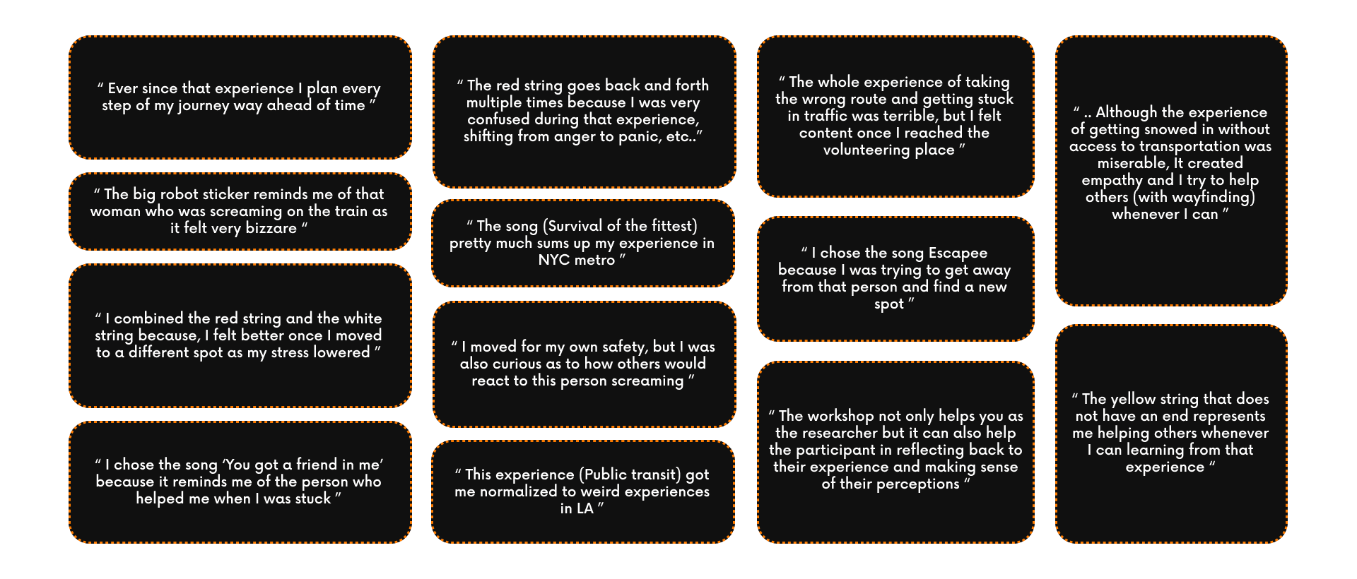 The process developed through this project not only addresses current gaps in mobility research but also demonstrates potential for broader application. Beyond capturing socio-emotional dimensions of travel, it can serve as a tool for generating insights, deepening understanding of overlooked dynamics, and fostering personal reflection. Looking ahead, this approach could be extended to mobility planning, as well as to other domains of human experience.